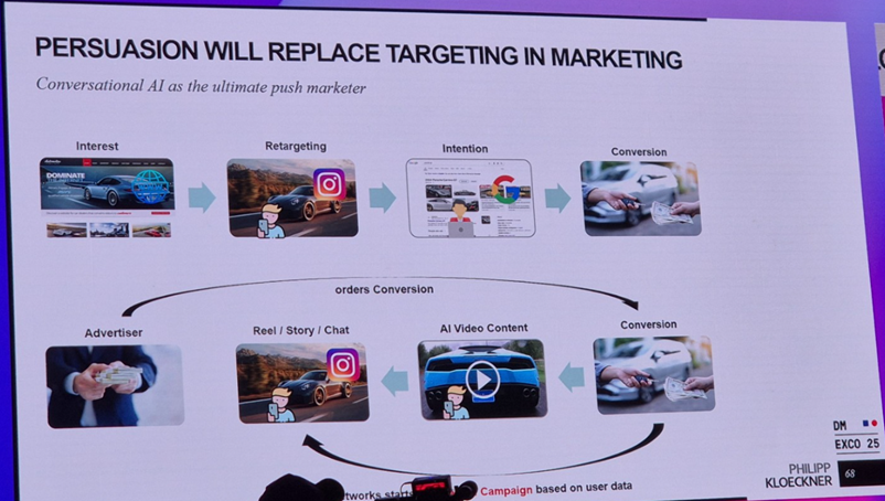 Tekoälyn tuleminen hakuihin (Gemini, Co-Pilot, ChatGPT jne.) muuttaa kuluttajien hakukäyttäytymistä merkittävästi. Sen pohjalle kehitetään erilaisia AI-pohjaisia agentteja, jotka tuntevat käyttäjän ja osaavat suositella kiinnostavia sisältöjä tai ohjata suoraan verkkokauppaan. Tämä Philipp Kloecknerin esittelemä malli (kuvassa) haastaa jatkossa perinteiset markkinoinnin funnel-mallit, joiden puolesta osa puhui ja osa tyrmäsi ne vanhentuneina.