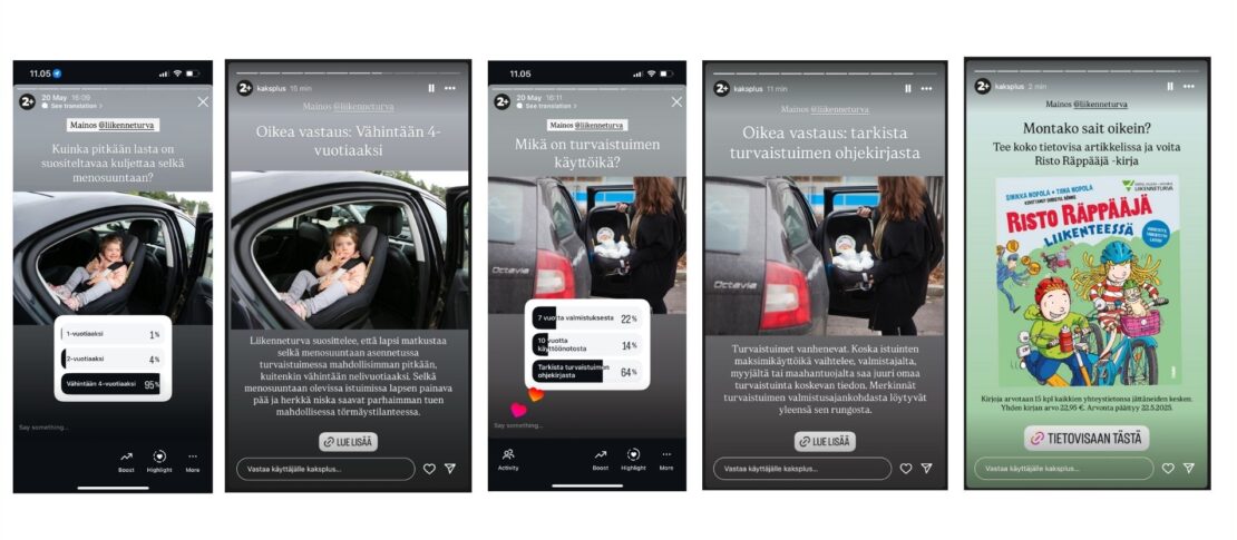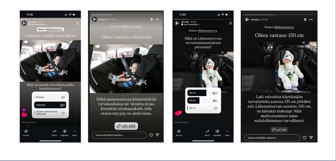 The quiz didn’t just attract clicks — it was designed to evoke emotion and discussion. Kaksplus Facebook posts about the campaign sparked lively, constructive conversations on child car seats, boosters and safety recommendations. Comments were positive and community-driven. Many readers felt the topic was both important and timely, sharing their own experiences and tips.