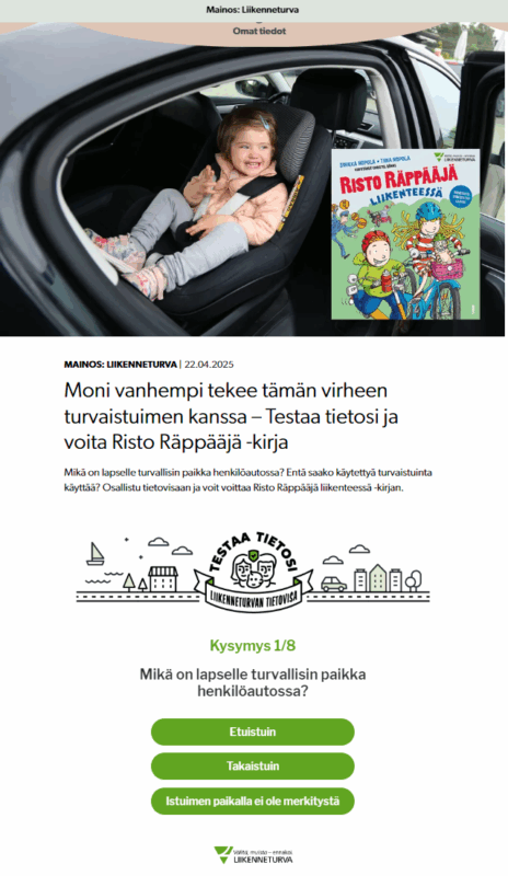 Liikenneturva aimed to reach families with children with an important message about safe travel for children in cars. The multichannel campaign executed through Otavamedia’s channels combined a native article, an interactive quiz and visibility across digital and social media platforms.